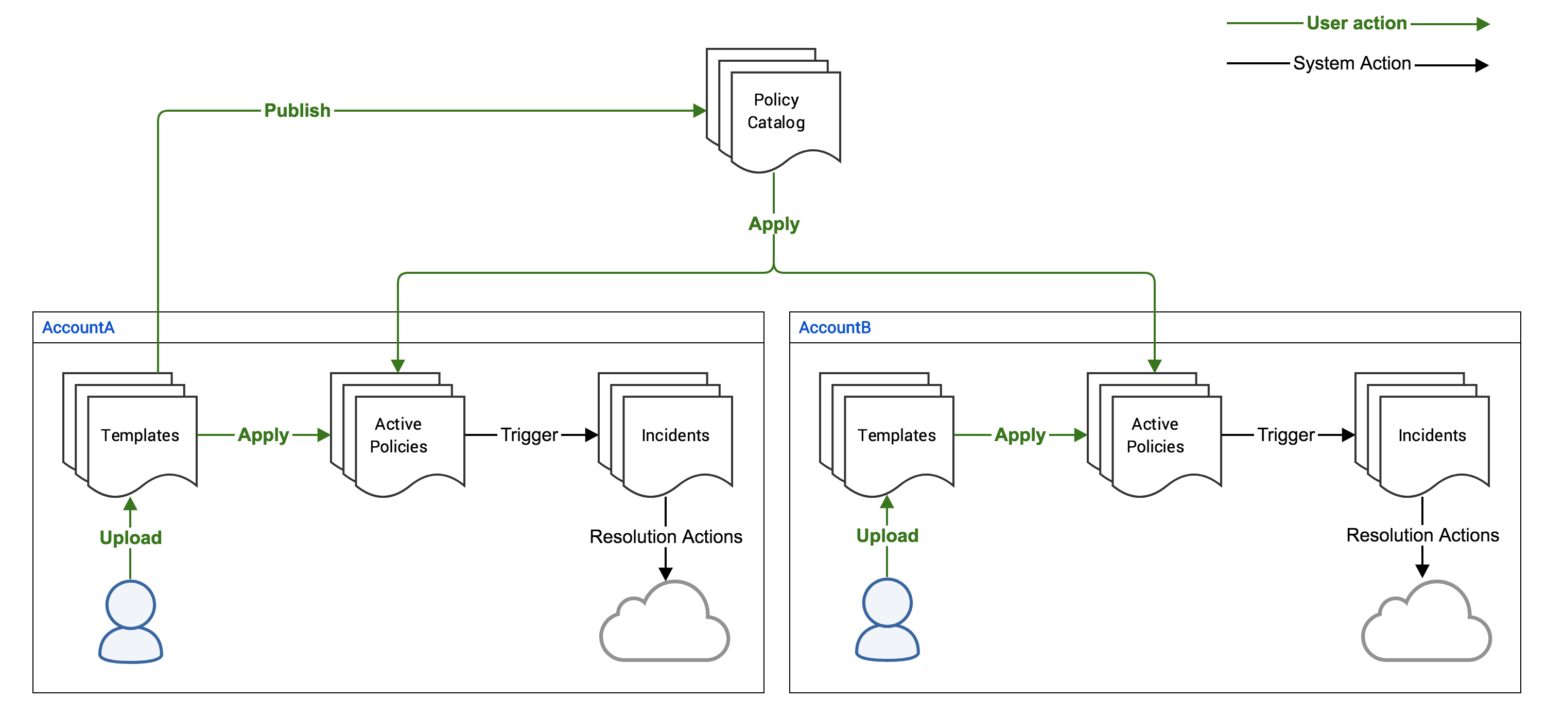 The below diagram outlines how the policy engine works. Typically a policy developer will develop policy templates and test them by uploading to the Templates page. Once the policy template is ready to be published, the Publish policies can choose to publish it to the Catalog making it available to everyone in the organization.