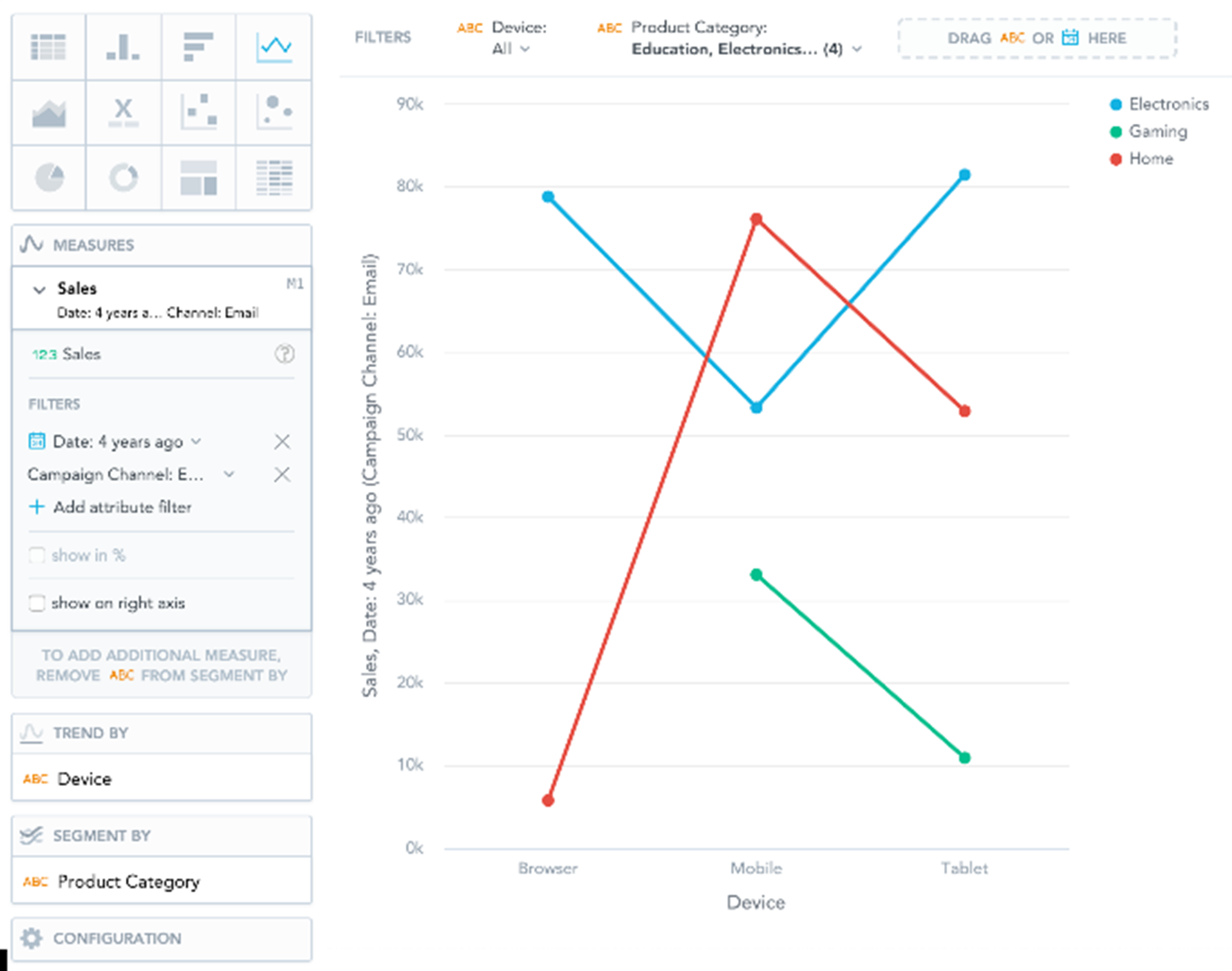 Line charts have the following sections: Measures , Trend by , Segment by , and Configuration .