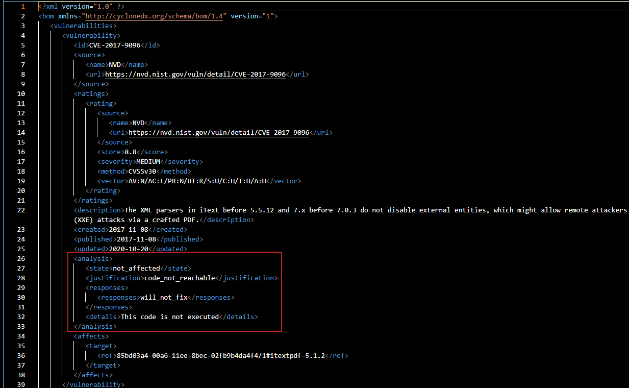 The CycloneDX VEX (Vulnerability Exploitability eXchange) report provides details for vulnerability exclusions—that is, those vulnerabilities that are associated SBOM parts but, after your analysis, do not pose a security threat to your application code. Each exclusion listed in the report identifies the SBOM part with which the vulnerability is associated and includes an analysis section describing why vulnerability is not an exploit risk based on the context in which the part is used in the code.